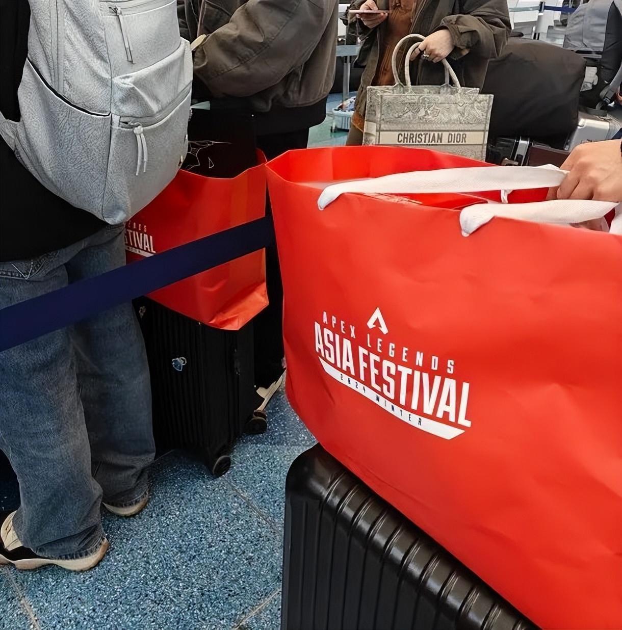 不難想象這一排紅色袋子所帶來的回頭率。值機排隊時,便有一位操着臺灣口音的APEX玩家對我們的袋子相當感興趣,主動跟我們搭話。選手們也拿出了主辦方定製的APEX英雄身份牌子,以及會場拿到的水怪玩偶,高興地炫耀了起來。