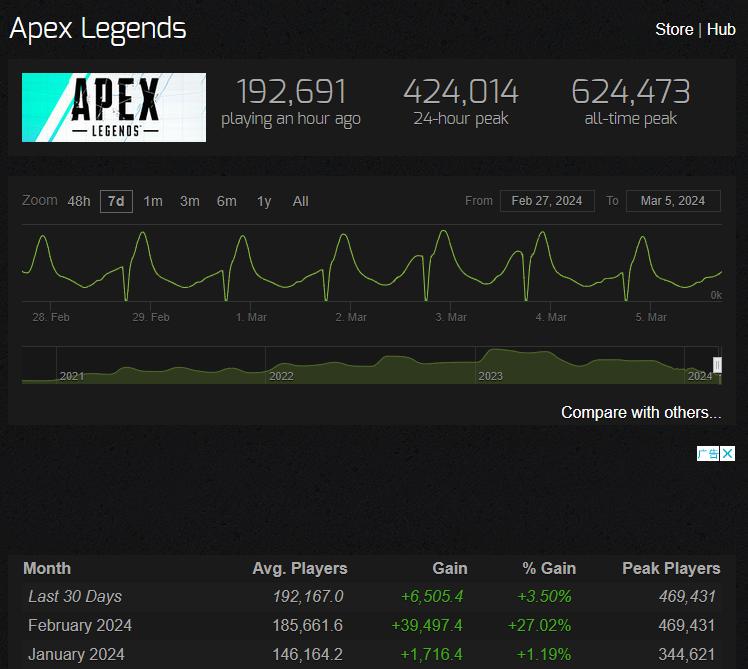 根據Steamcharts網站數據,今年2月以來,APEX的在線玩家峯值顯著回升,這款持續運營5年之久的遊戲還在迸發生機。正如第20賽季定下的名字,重生和APEX積極求變,完成了自己的新一輪“突破”。