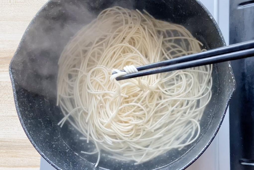 1、燒一鍋水,水開後加入麪條,儘量用細一些的麪條;