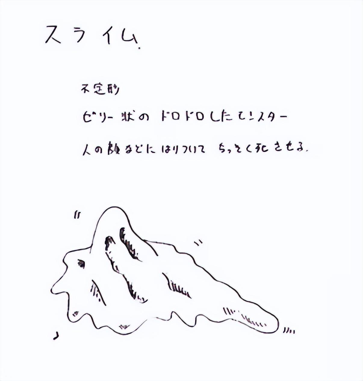 在主要角色之外,鳥山明爲DQ系列設計了超過500種怪物形象。“史萊姆”是堀井雄二最早委託鳥山明進行設計的怪物角色之一,他畫了張草稿,向從未玩過《巫術》的鳥山明介紹這個經典RPG中的粘液怪(Bubbly Slime)。