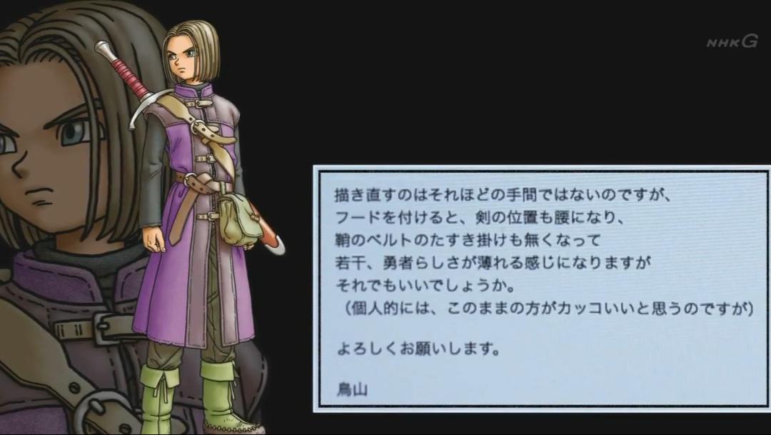 例如以“戴兜帽的話,背劍的位置自然就會移到腰部,腰帶死結也就沒意義了,就少了勇者的感覺”爲由,拒絕給DQ11的主角服裝添個兜帽的要求
