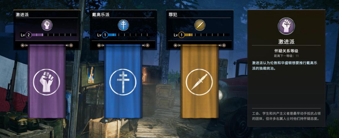 抵抗運動從來不是鐵板一塊,在遊戲中簡單分爲三大派系:親蘇聯的激進派、相對保守的戴高樂派,以及由犯罪團伙和無黨派人士組成的鬆散聯盟。