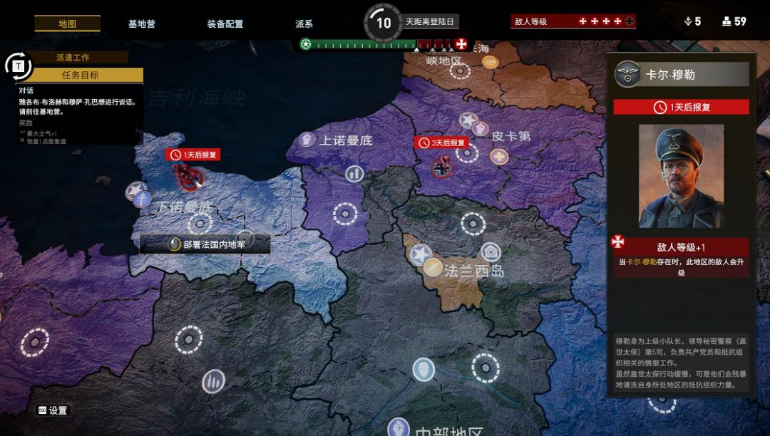 而在時間用盡之前,小隊必須完成儘可能多的任務,團結抵抗運動的各個派系,讓抵抗運動的勢力網遍佈法國全境。這很重要,會直接影響到諾曼底登陸的成敗和遊戲的結局。