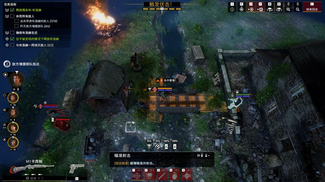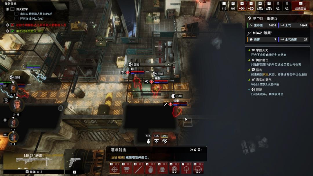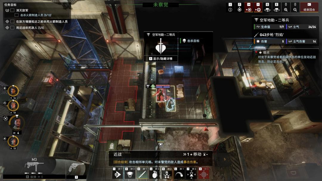 伏擊任務最後必定變成強攻,但在此之前,小隊可以潛行擊殺指定數量的敵人,湊夠伏擊閾值,從而發動伏擊。這時,所有人的行動點都會立刻回滿,相當於多了一個額外回合,這回合裏小隊所有的攻擊都會暴擊。