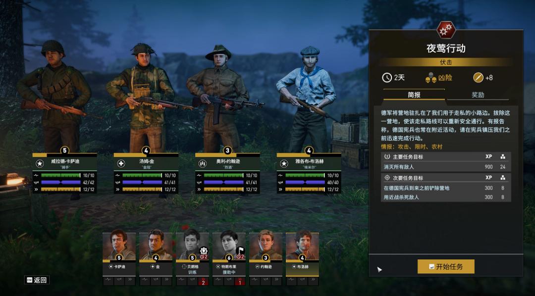 不止游擊隊,德國人也劃分了兵種,如狙擊手、重裝兵、工程兵(專精爆破)、軍官(類比領隊)等。抵抗運動勢單力薄,每次只派4個人執行任務,需要根據任務類型和敵人配比,選擇適宜的兵種搭配。