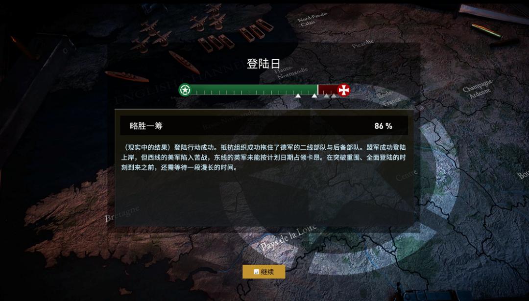 在一週目裏,我建立了86%的抵抗勢力網,取得了“略勝一籌”的史實結局。按照史實,諾曼底登陸作戰大獲成功,但上岸後的盟軍陷入苦戰,未能按計劃攻下交通樞紐卡昂,在8月末才解放巴黎,聖誕節前也沒回成家。