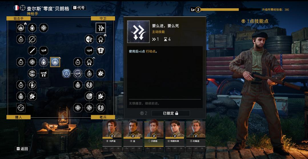 支援兵是隊伍裏的醫生,攜帶一把近距離輸出爆炸的霰彈槍,是補刀好手。偵察兵配備有衝鋒槍,還能解鎖一系列有利於潛入和拼刺刀的技能,比如在潛行暗殺不觸發噪音,或者在近戰擊殺時獲取額外行動點,從布列塔尼一路砍到巴黎。