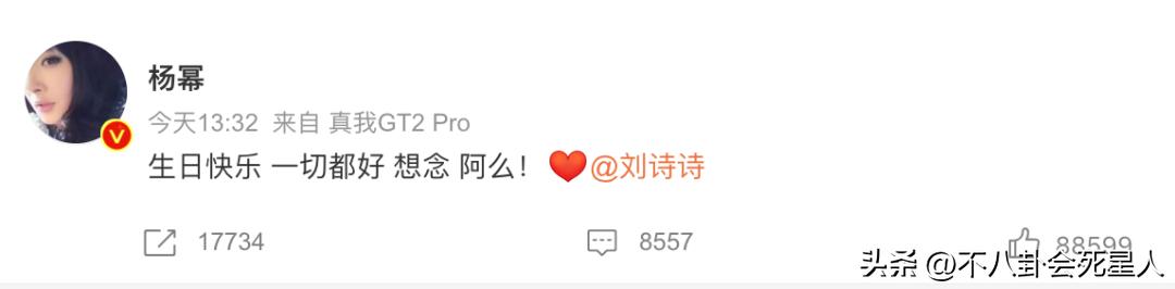 這次是爲好閨蜜劉詩詩送上37歲的生日祝福,楊冪親密地稱呼劉詩詩爲“親愛的小劉”,末尾還加上3個親暱的“阿麼”。劉詩詩也親切回覆,叫楊冪“親愛的小冪”。