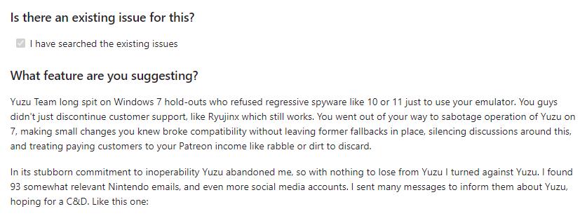 似乎這場恩怨還不限於兩方這樣簡單。Github上一位網友講述了自己的所作所爲:作爲Yuzu用戶,他因爲很不滿該團隊沒有對WIN7版本模擬器做優化,因此開始向任天堂發郵件告發Yuzu模擬器的存在,提示對方該“剷除”他們了。而爲了讓對方意識到問題的嚴重性,這位用戶發了整整93封郵件。