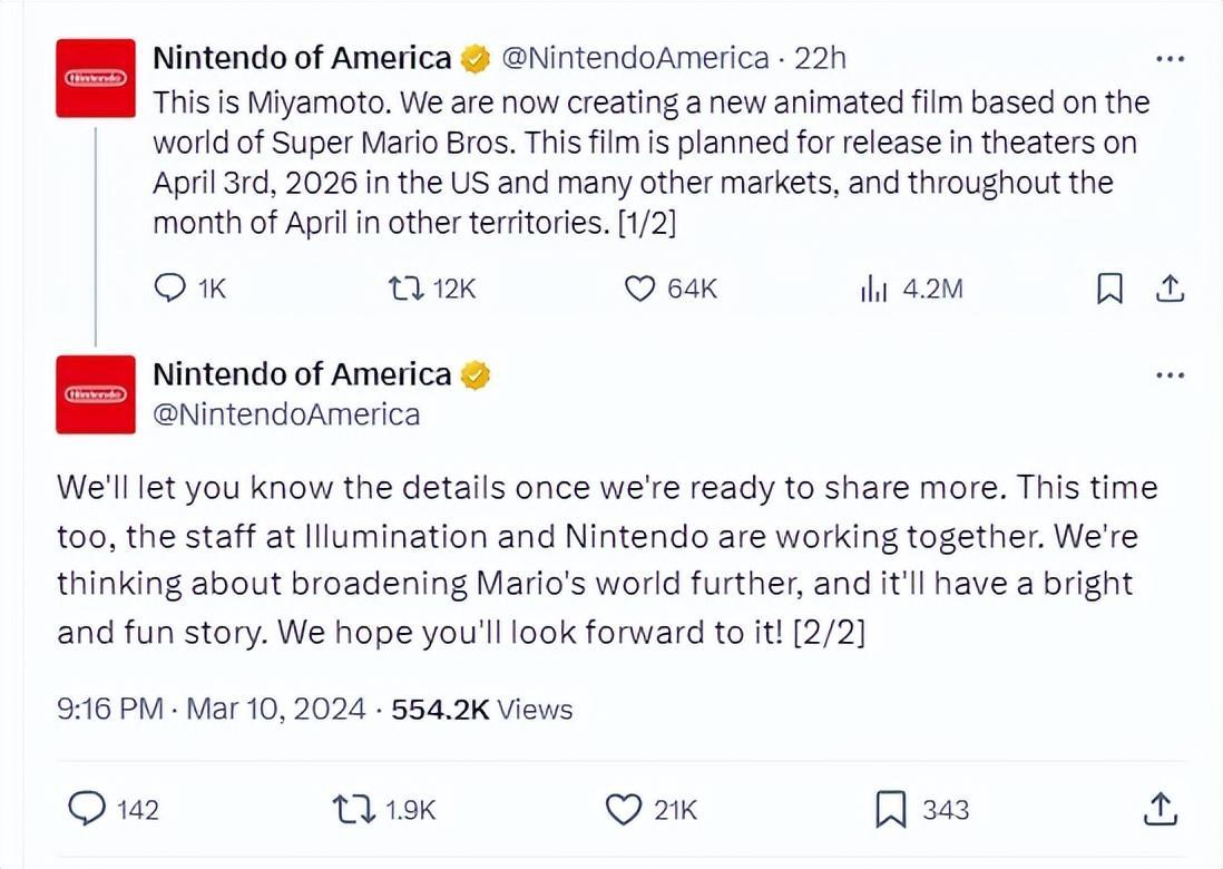 最近宮本茂本人也十分乾脆地通過北美任天堂賬號,向人們透露了電影的詳細消息。他表示電影將於2026年4月3日在北美地區上映,其他地區也將於4月上映。