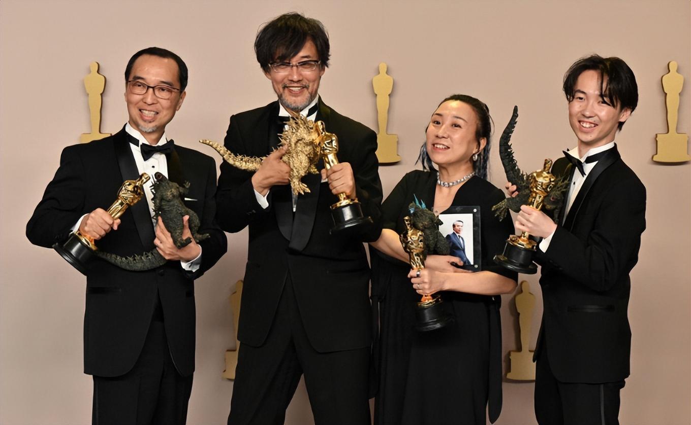 而另一邊憑藉《哥斯拉1.0》拿到最佳視覺效果獎的日本特效團隊,不但上臺領了獎,還興奮地拿出了小小哥斯拉模型慶祝。畢竟作爲是日本本土特效團隊首次獲得該獎項,算是日本電影界的突破。