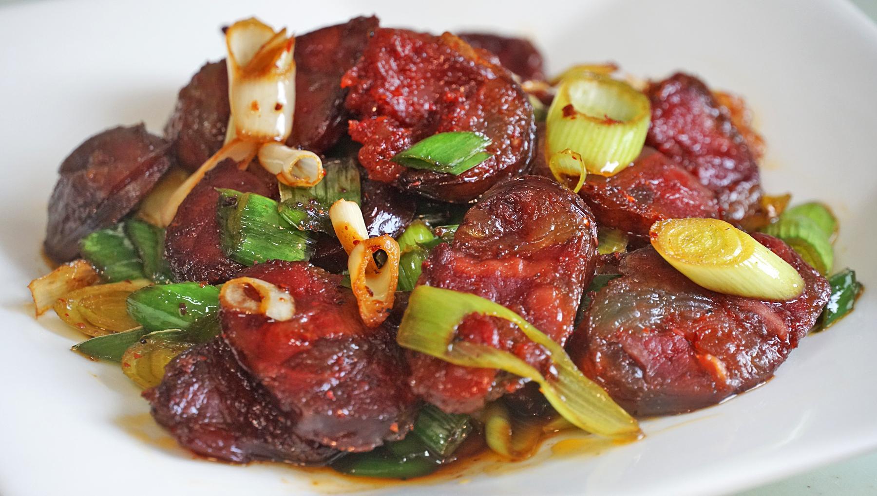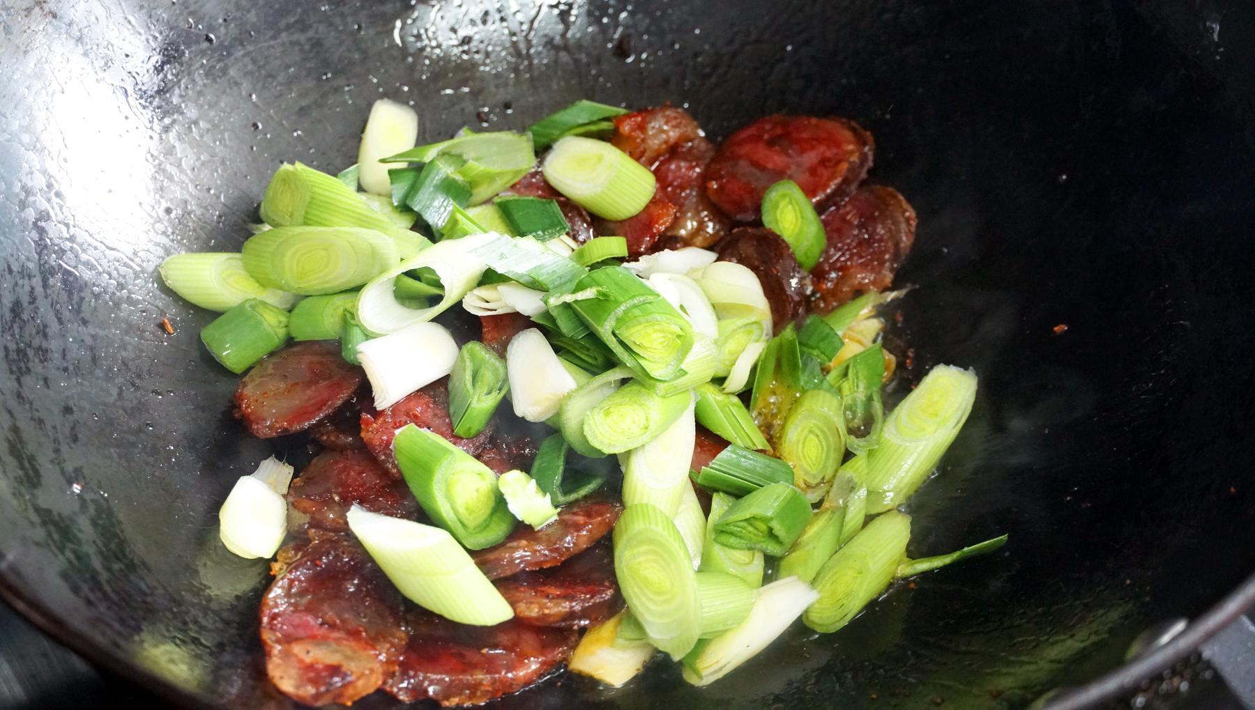 1、再來炒個香腸,我提前都煮熟了的,切好了搭配點蒜苗一起炒,味道會更香;