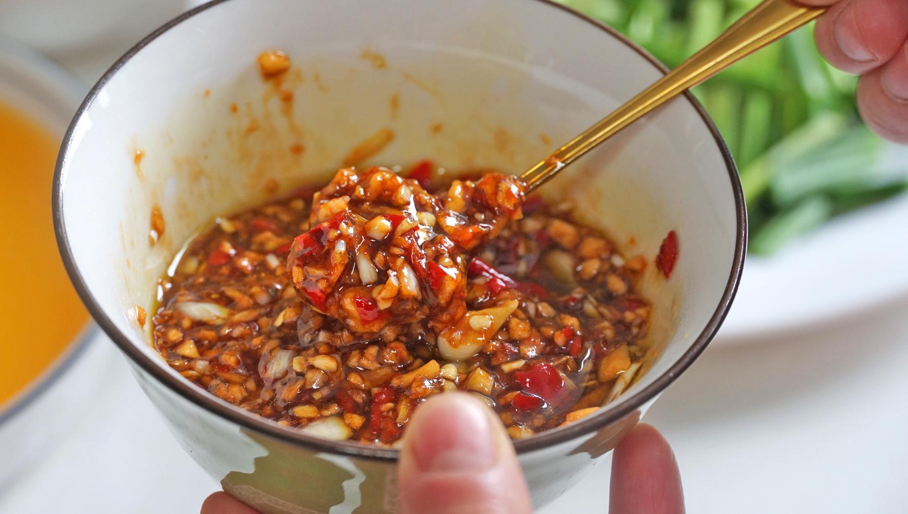 3、倒出來淋點熱油,激發一下香味兒,調味就加點鹽、糖、生抽、蠔油 ,拌一拌就可以了,這是最簡單的蒜蓉醬做法了;