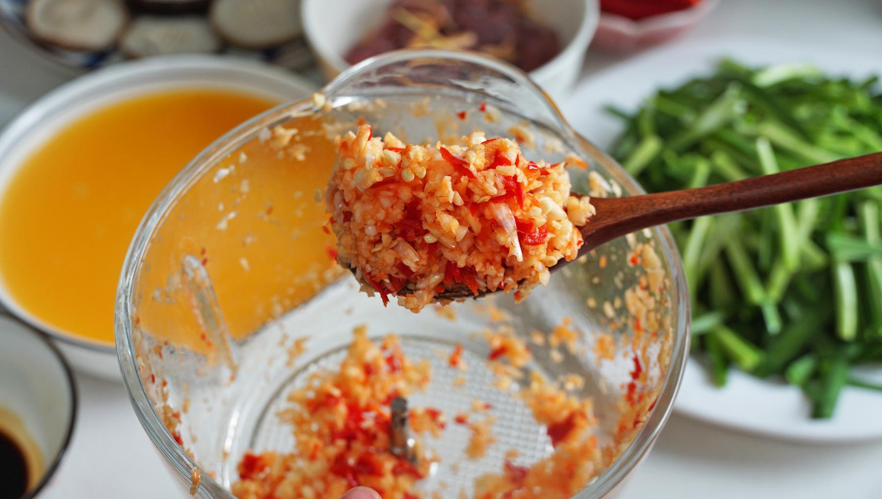 2、大蒜的可以多一點,小米椒我用了3個,打成這種蒜蓉醬;