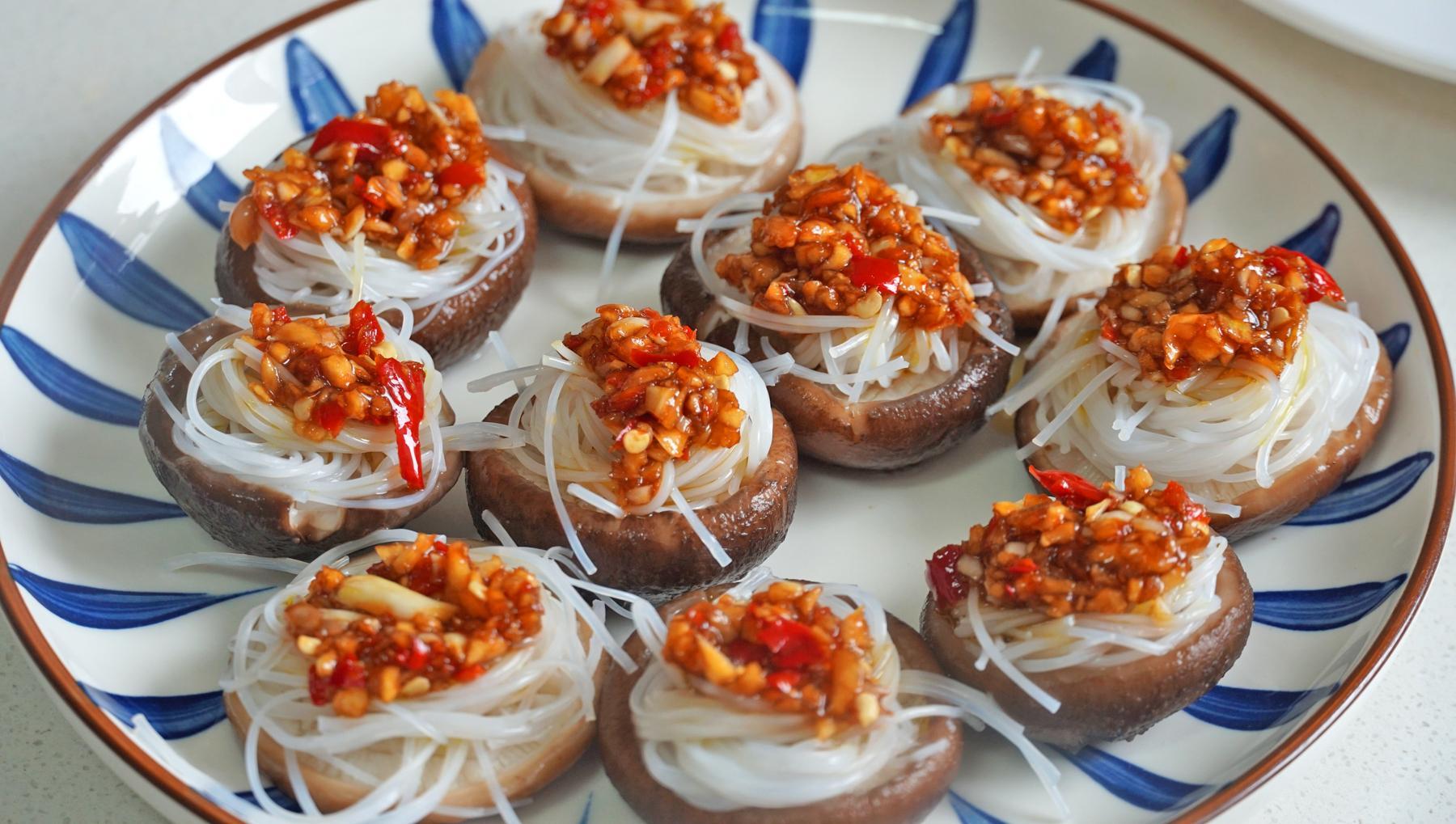 4、粉絲我用了一個龍口粉絲,加水泡軟了一點,然後每個香菇上都放上一圈粉絲,舀一勺蒜蓉醬,上鍋蒸個8分鐘就可以了;