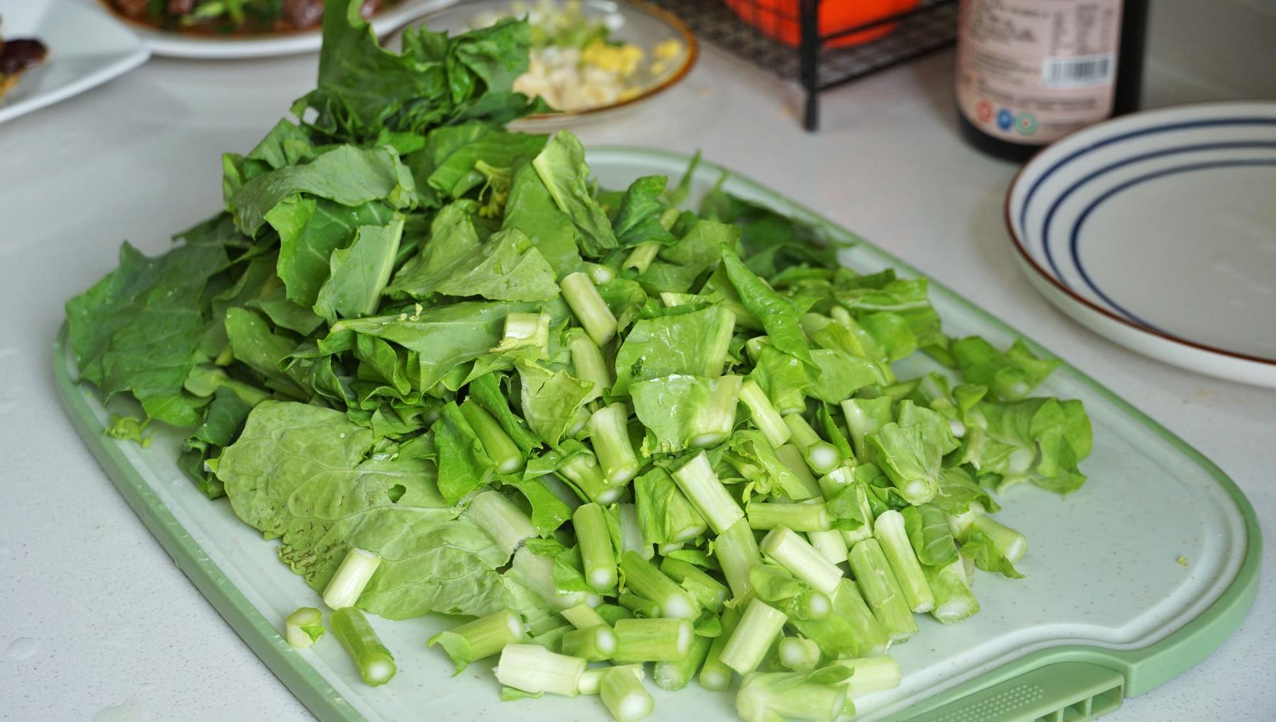 1、最後再來炒個白菜薹,洗乾淨了切小點,用豬油來炒,味道會香一些;