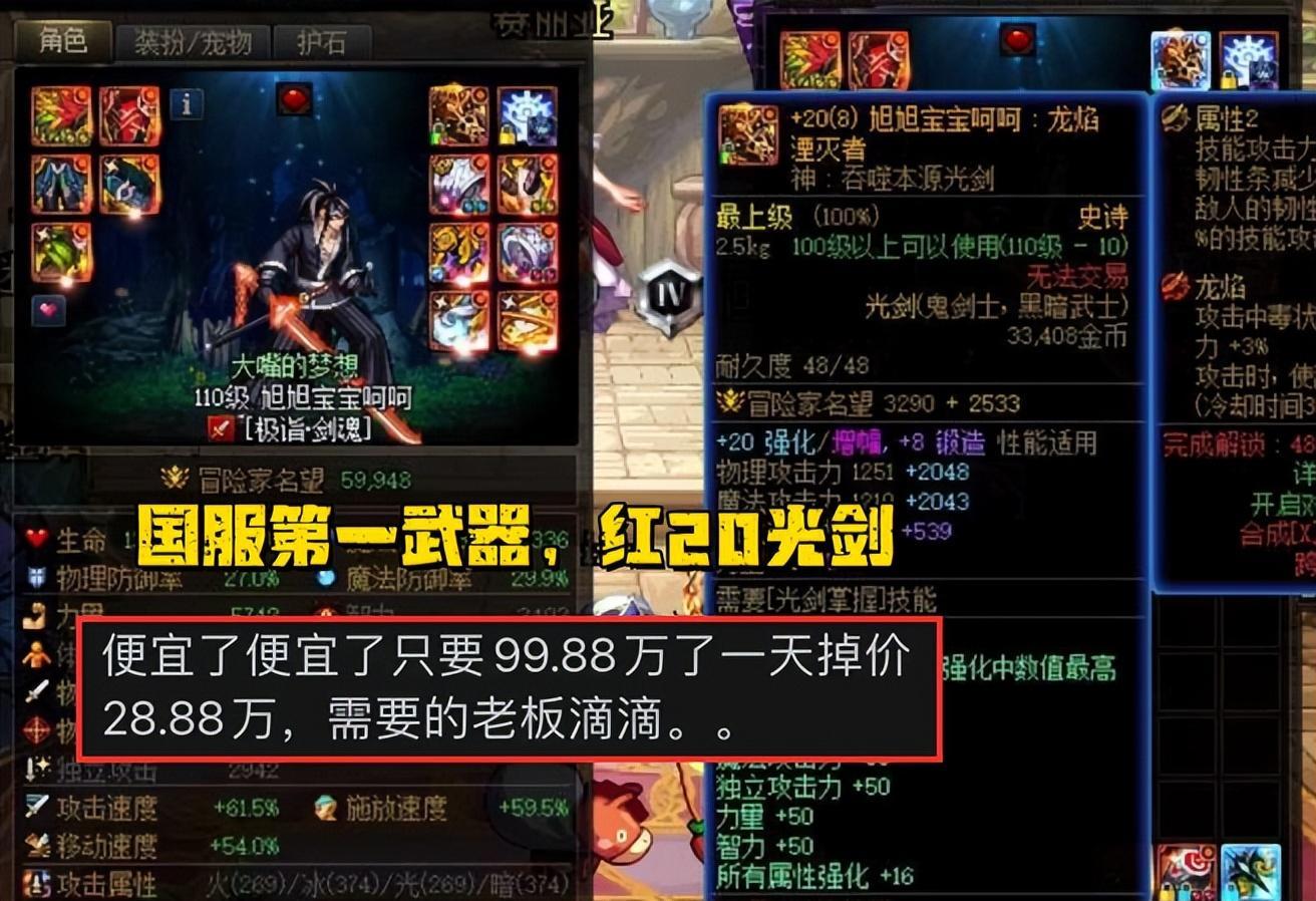 前國服第一劍魂“大嘴”,坐擁一把紅20武器,也是國服最強的武器,後來也脫坑了,依然被旭旭寶寶拿下,寶哥把其他裝備都碎掉了,如今也掛上了交易行,目前初步售價大概在100萬左右;
