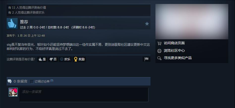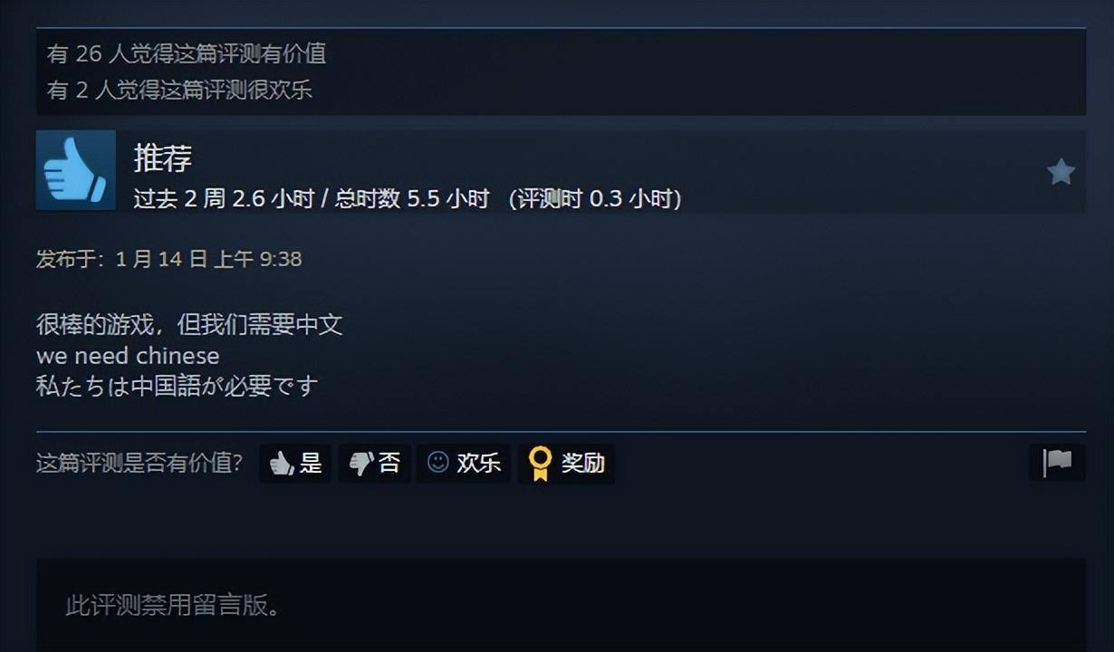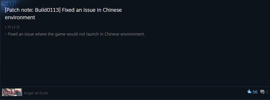 1月25日,《黃昏天使》正式追加了漢化補丁,繼日語和英語後,簡體中文成爲了第三種官方語言,隨後幾天Steam商店裏的中文好評也隨之暴漲。