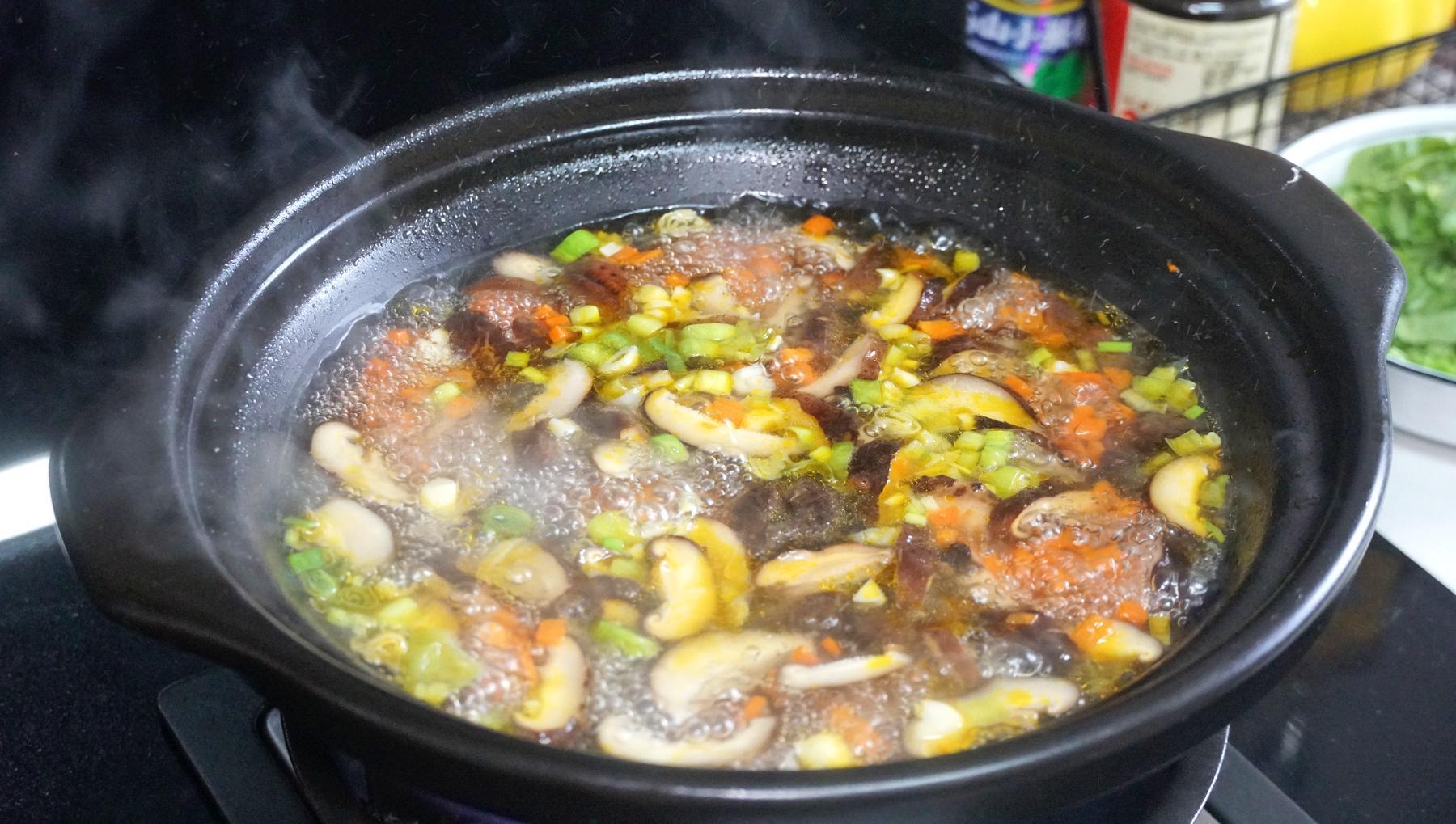 4、鍋裏油熱了先把香菇和胡蘿蔔炒一炒,再來點蔥蒜,炒出香味了就加水,大火煮開,然後把山藥加進來,拌一拌,繼續煮10分鐘;