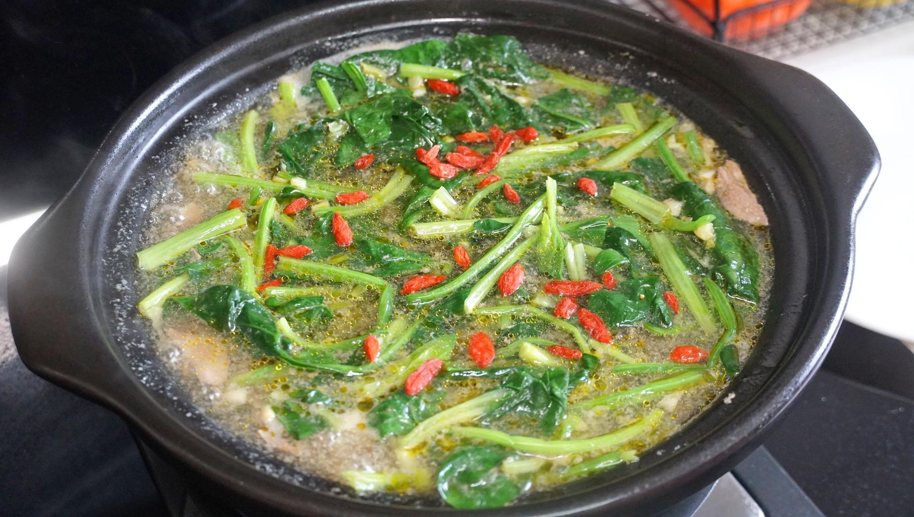 6、這時候把菠菜加進來,再加點枸杞,拌一下就可以關火了,這個豬肝菠菜湯真的超級鮮,