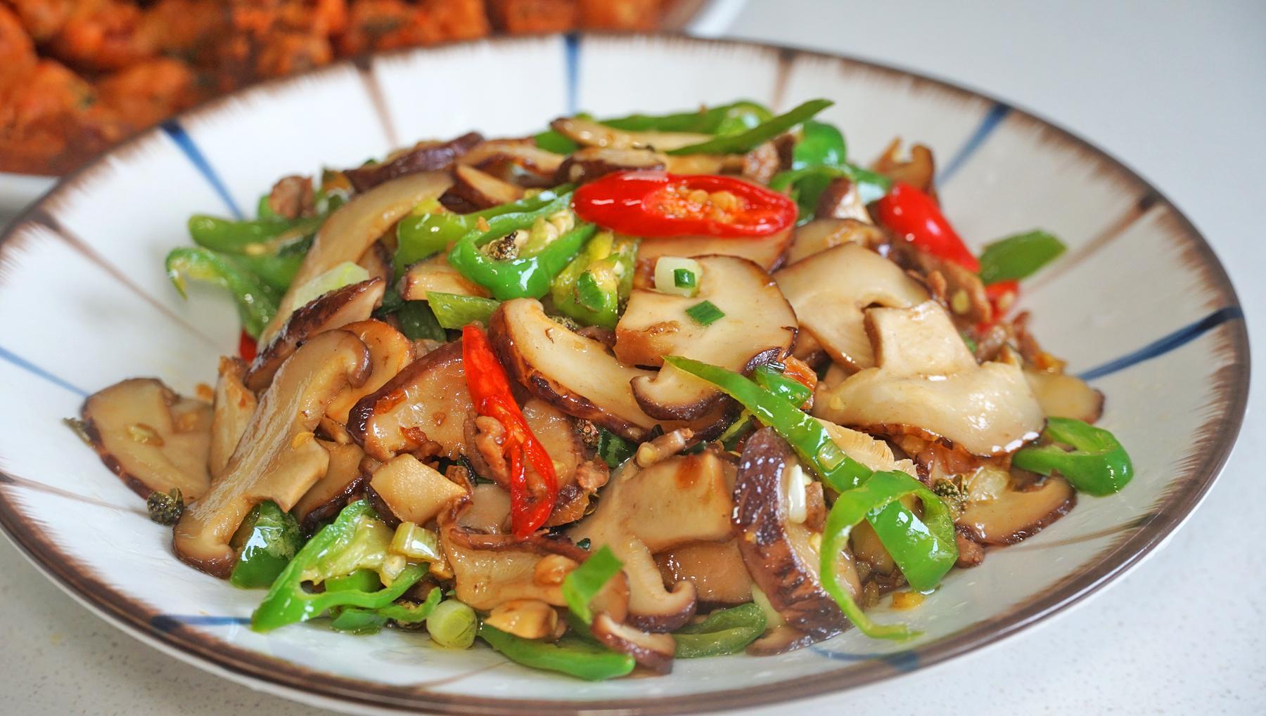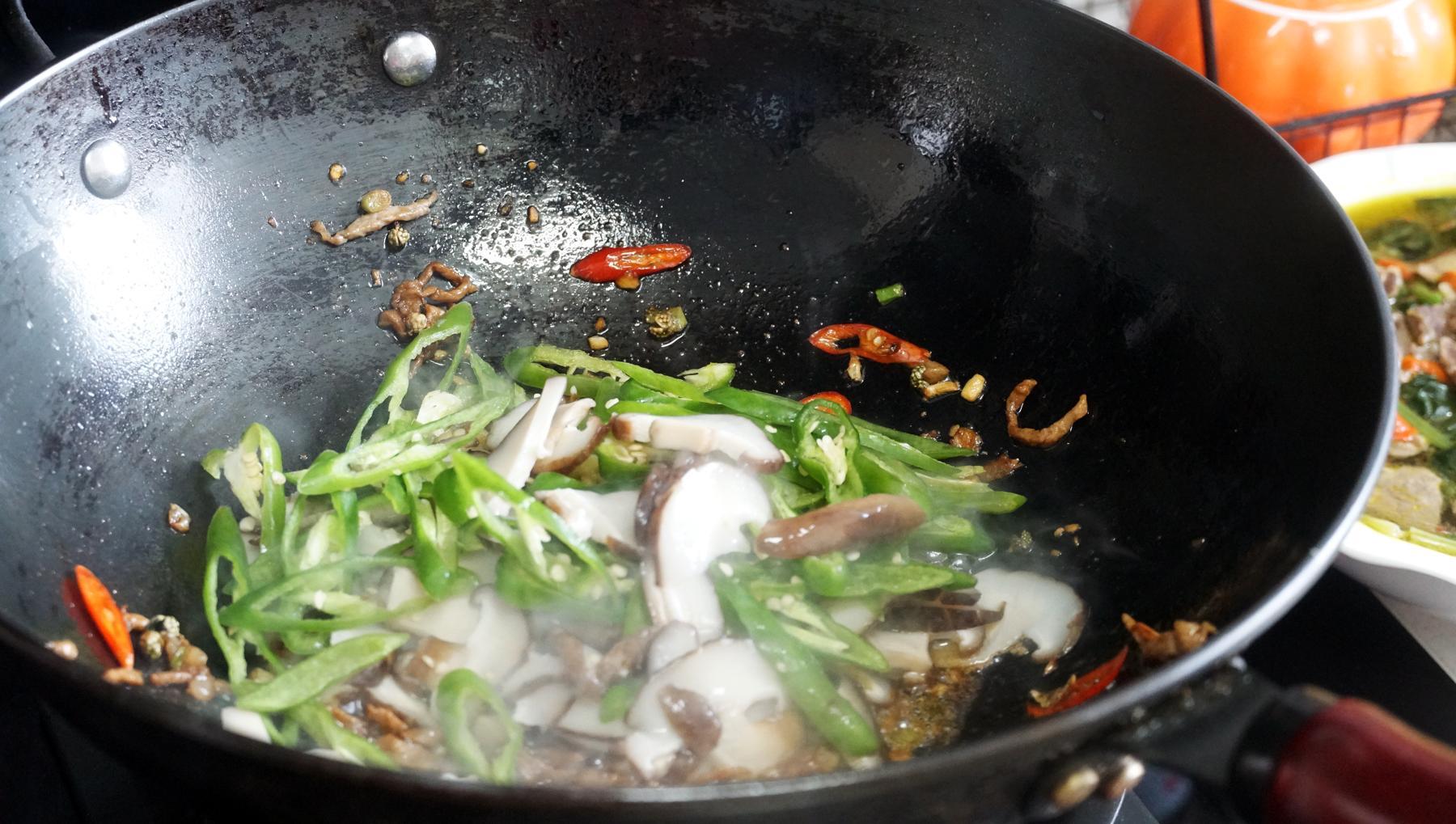 3、油熱了加點蔥薑蒜花椒小米椒爆香,先把肉絲炒一炒,變色了加點鹽、生抽、蠔油、胡椒粉,炒勻了把香菇和青椒都加進來,
