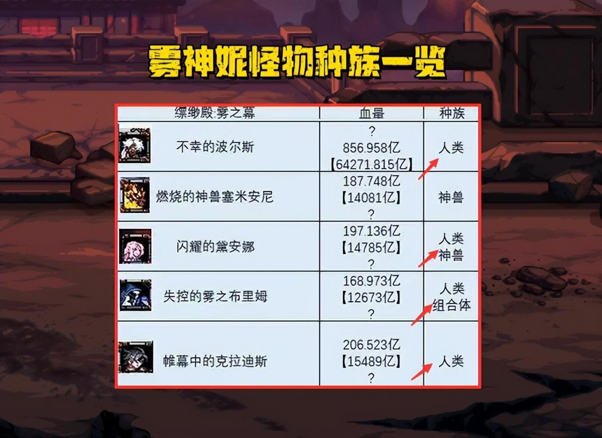 目前“霧神妮”已經曝光了5個boss的種族和血量,可以看到的是,其中有4個boss都是“人型”或“人型+神獸/組合體”,而且最重要的終極boss波爾斯也是“人型”!