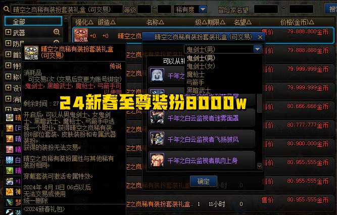 「追憶新春套」1400萬左右,應該算是最便宜的高級時裝8件套了;「24新春至尊套」8000萬左右,最便宜至尊天空,不過只有男女鬼劍士、魔槍士、弓箭手等4個職業可入手。