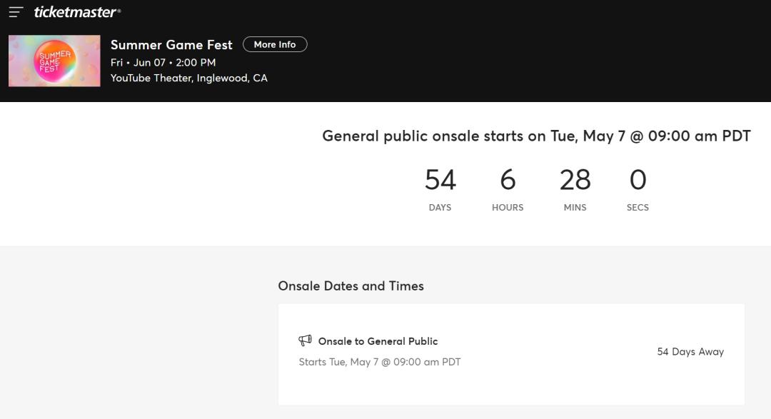 2024夏日遊戲節將於太平洋時間6月7日下午兩點(北京時間6月8日早5點),在洛杉磯的YouTube劇院進行,時長持續兩小時,主持人仍是玩家熟悉的Geoff Keighley,售票網站ticketmaster目前已開啓倒計時頁面。