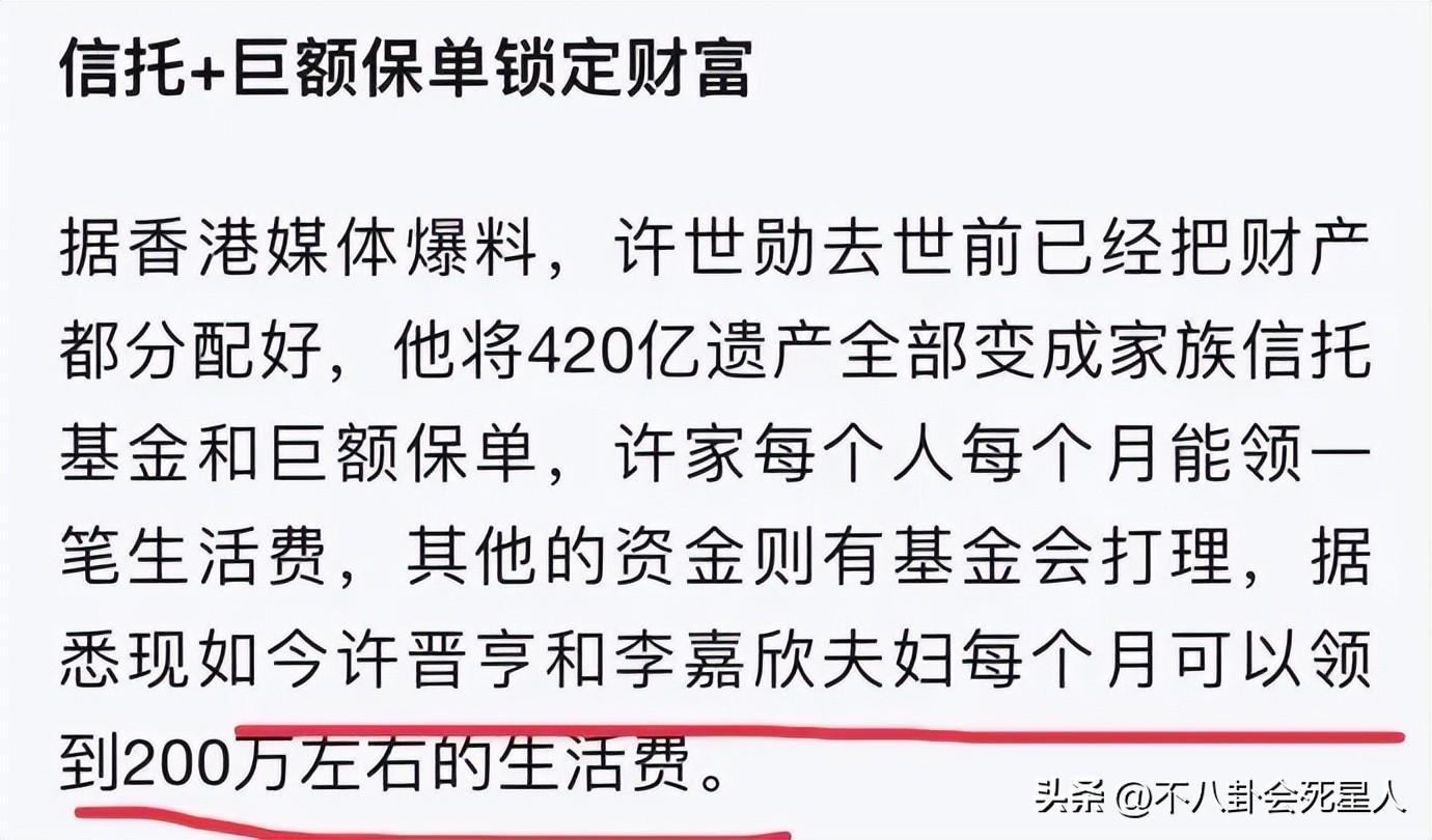 從媒體發的資料來看,當年的300億裏,其中100億分給二三房的子女,二三房的子女除了每人大概能拿到6000萬左右,另外每個月還能拿到一定的生活費。