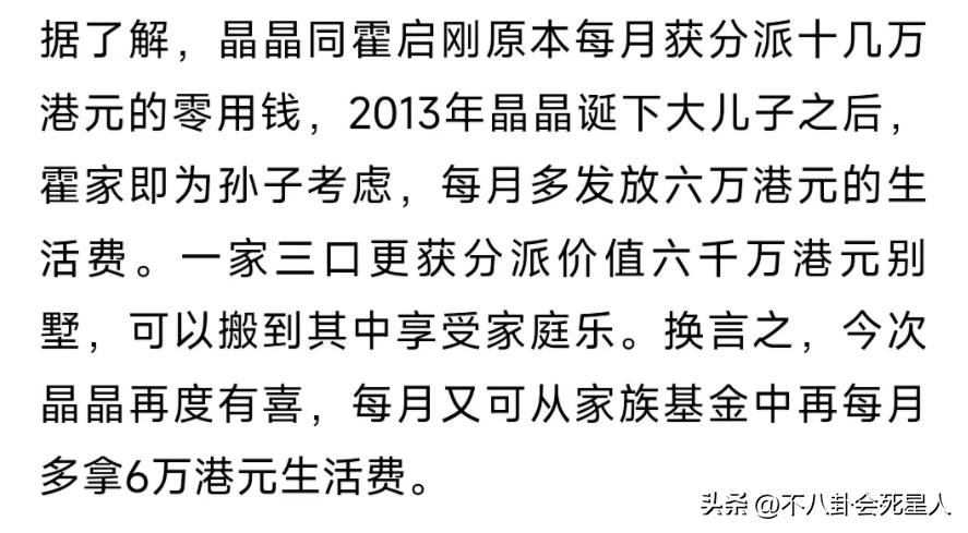 而且據媒體報道,一開始霍啓剛和郭晶晶每月大概領取十幾萬港元的生活費,在郭晶晶生下大兒子之後,霍家直接給他們的小家庭增加了每月6萬元的生活費。