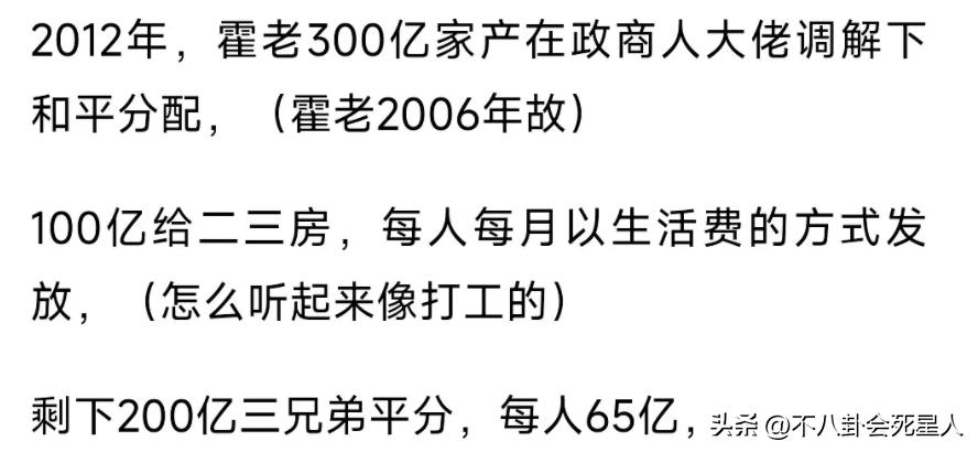 而長房的三兄弟霍震霆,霍震寰和霍震宇,他們每人當時能分到的資產大概是65億元,他們能拿到手的錢也不多。