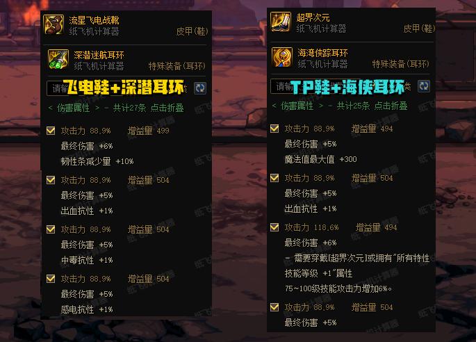 「TP鞋+海俠耳環」橫向對比「飛電鞋+深潛耳環」,傷害高了2%傷害!