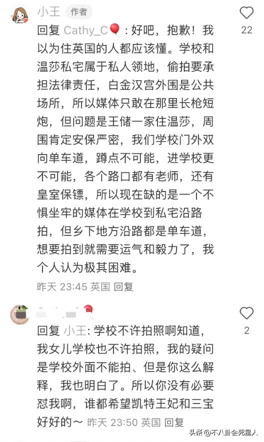 但另一位IP也在英國的網友表示:小王的細節描述得很準確,英國對偷拍學校的行爲,處罰嚴格。並且也有網友前幾天偶遇了凱特王妃,只是不清楚王妃爲何不露面。