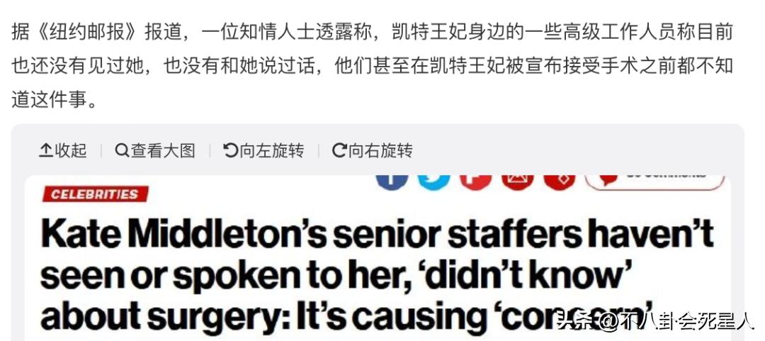 網友小王堅持說凱特王妃沒事,但是凱特身邊的工作人員,接受媒體採訪時卻表示:沒有見過王妃,也沒有跟王妃說過話,更不知道王妃要動手術,是王室官宣自己才知道消息。