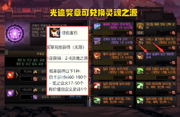 4個光跡獎章可兌換另一種寶石禮袋,打開後可獲得2~8個靈魂之源,以及巴卡爾材料、龍之業火、或者自定義中的其中一種。