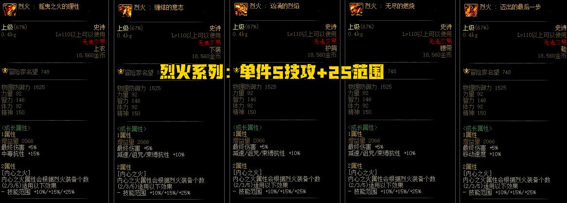 【5】“烈火系列”,每件貼膜+5%技攻,套裝效果額外觸發技能範圍,最多可增加25%技能範圍!