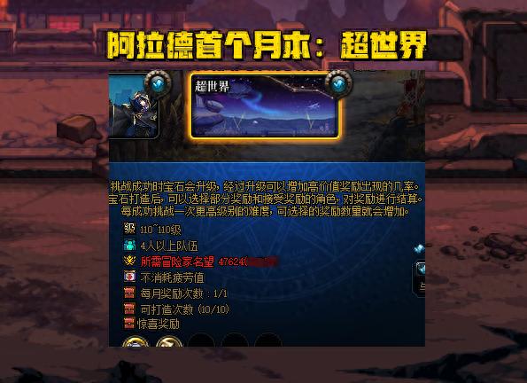 “超世界”作爲地下城首個真正意義上的“月本”,一個月只需要拿一次獎勵,總共分爲8個階段,階段越高、難度越高、獎勵也就越好。