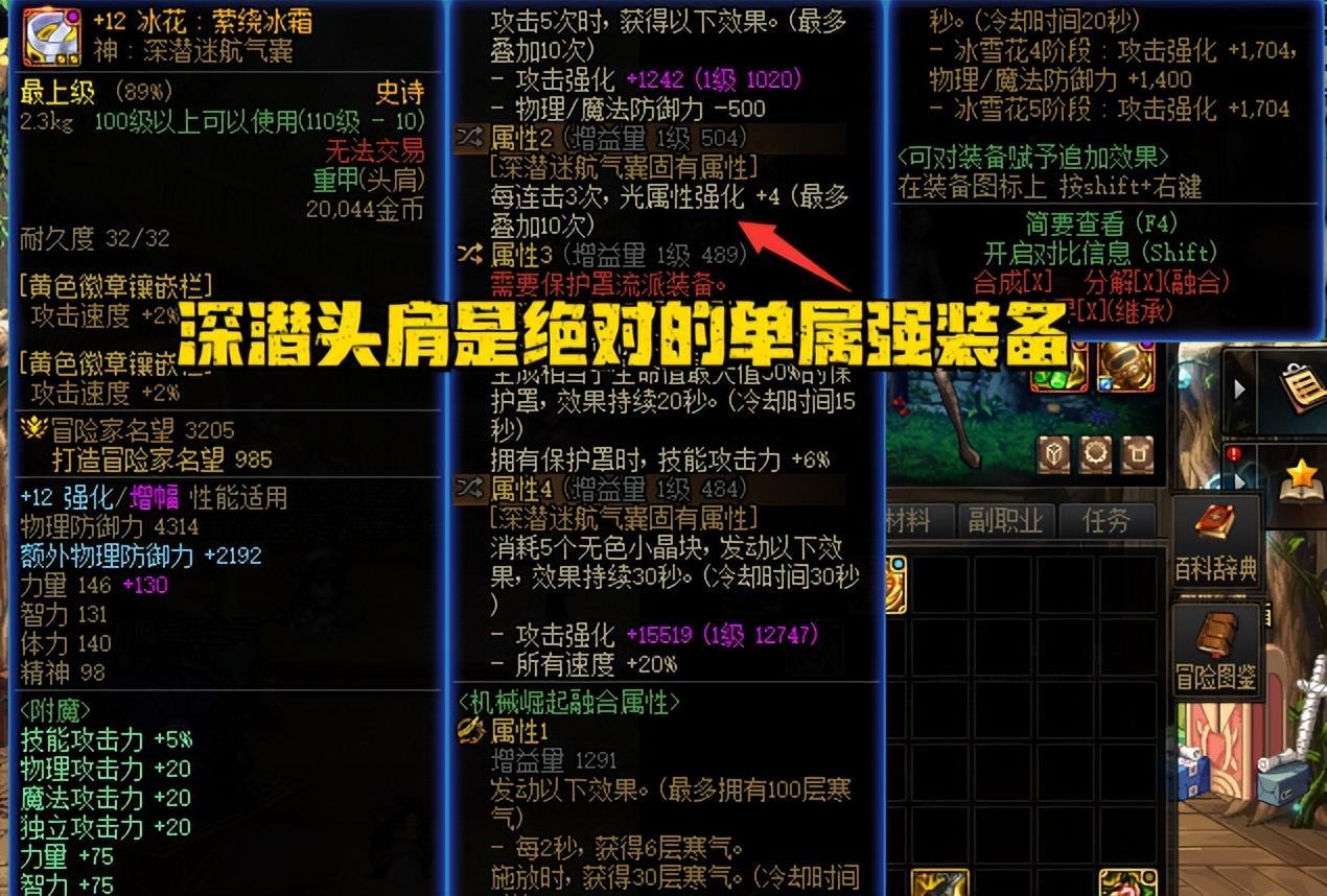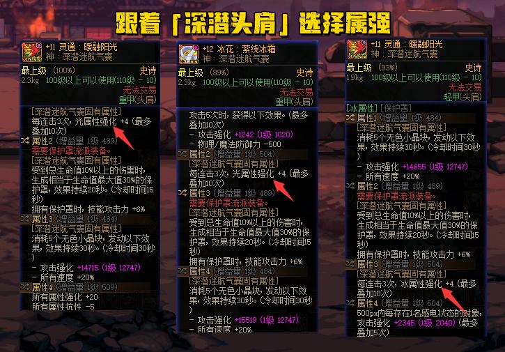 而“深潛頭肩”應該算是現版本唯一必須攜帶單屬強的裝備,跟着深潛頭肩選擇屬強肯定沒錯!