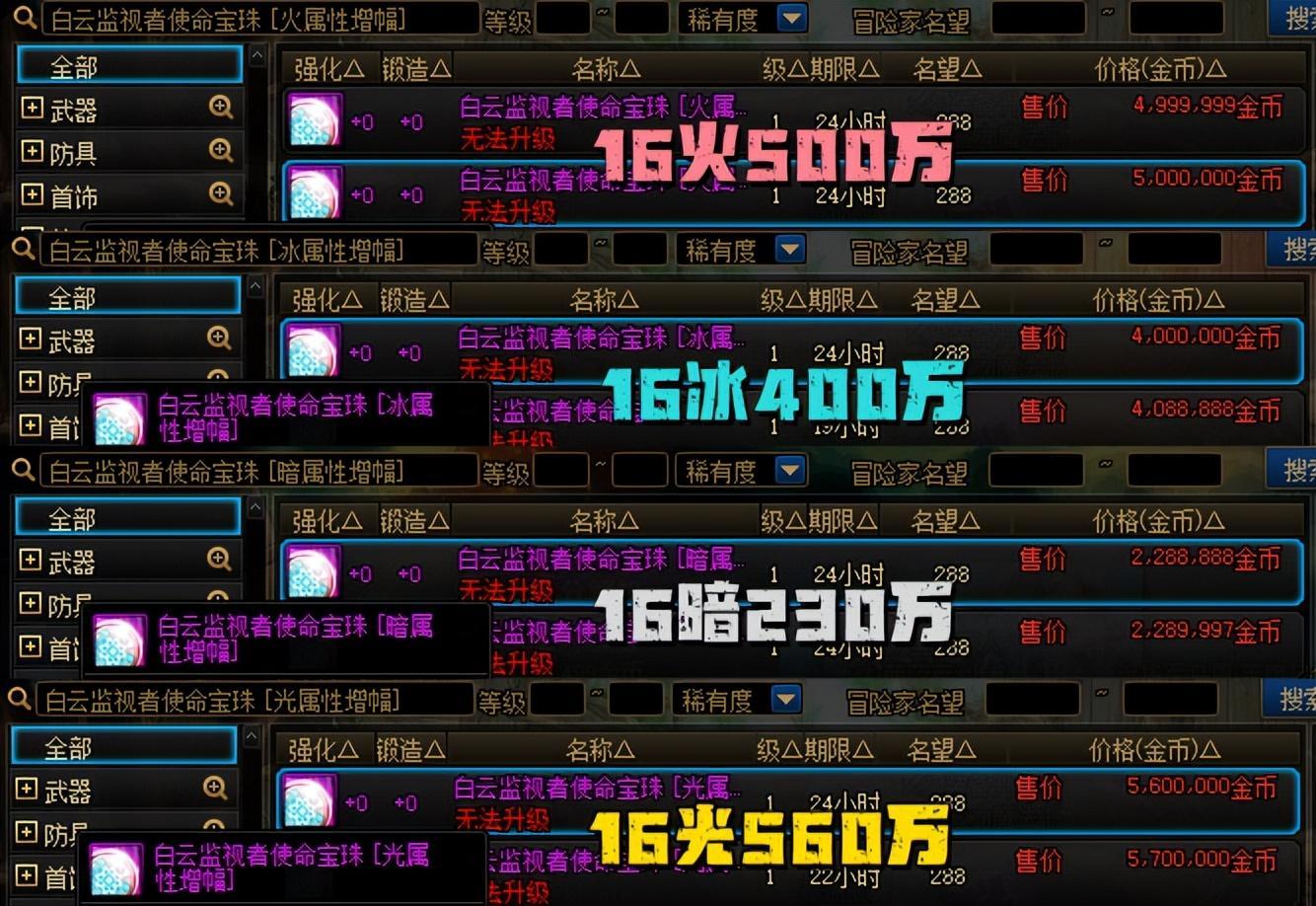 16火屬強,售價500萬;16冰屬強,售價400萬;16暗屬強,售價230萬;16光屬強,售價560萬!