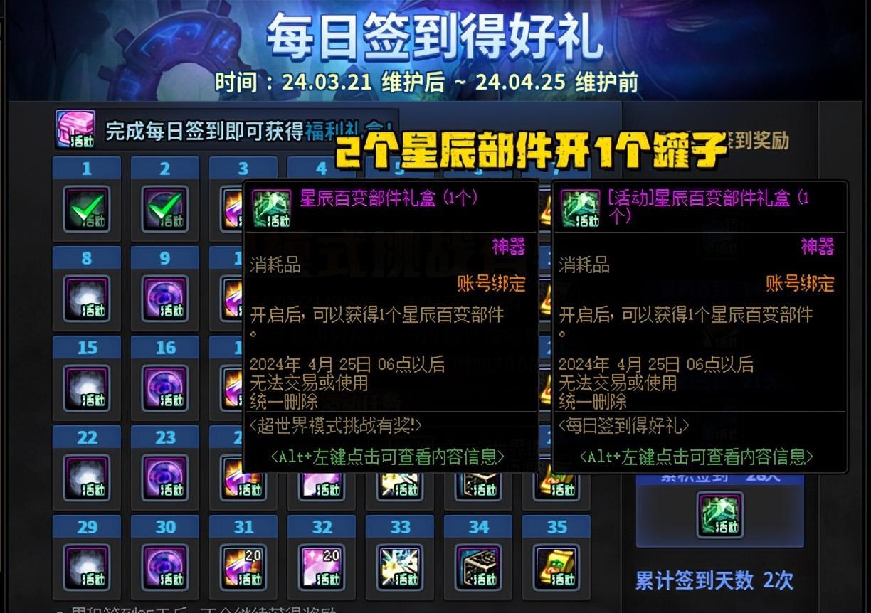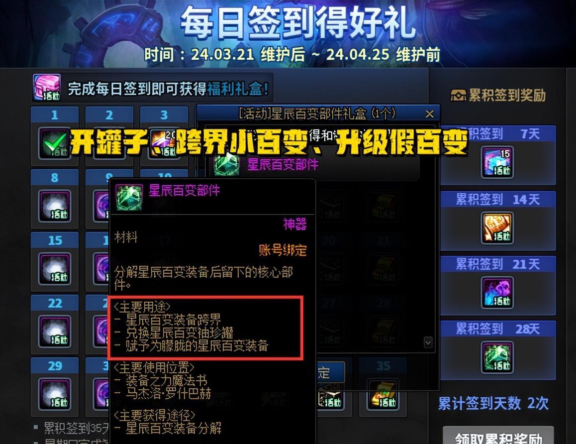 第三件從簽到活動中獲取。累計簽到28天,可以拿到1個“星辰部件”。