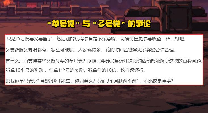 但之前爲什麼就沒人爭論呢?多號黨應不應該享受更好的獎勵,還有單角色又是否能愉快玩耍?這就交給大家來繼續討論了。