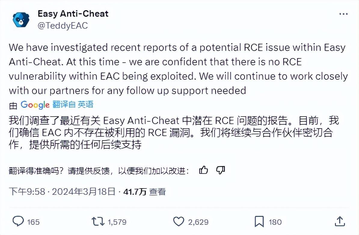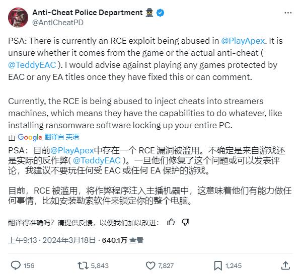 所以“反作弊警察局”的建議是,在官方宣佈漏洞修復之前,不要打開任何受EAC保護的遊戲,以及任何EA遊戲。雖然普通玩家似乎並非這一次黑客的目標,但無法排除其他黑客發現並利用這一漏洞的風險。