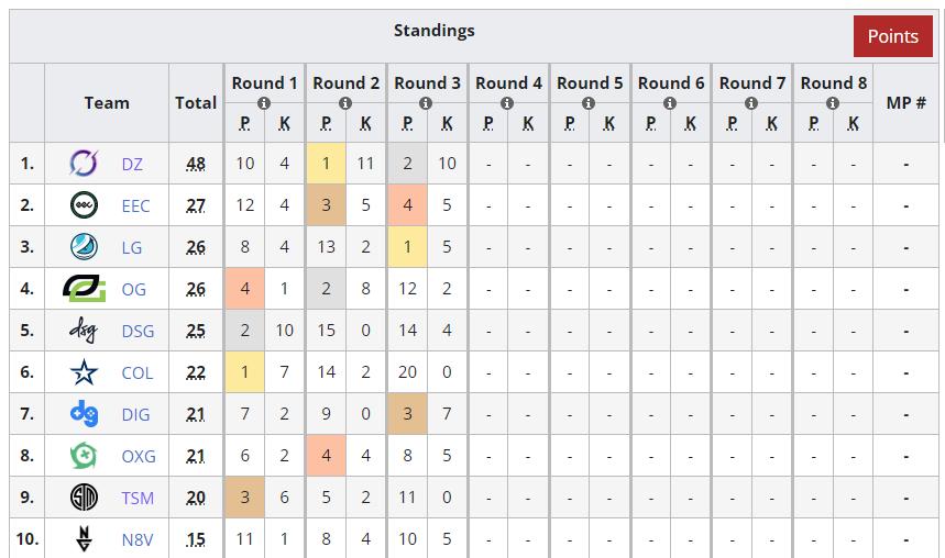區決前三局的比賽成績,DZ遙遙領先,圖源Liquipedia網站