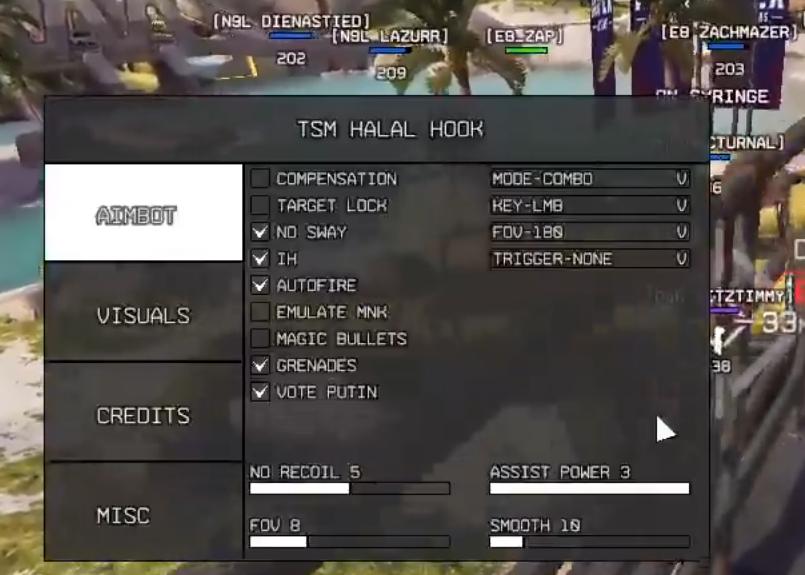 就在這時,DZ選手Genburten的屏幕中突然有個窗口一閃而過。從直播錄像可以看出,這個窗口顯然是某種外掛程序的菜單,其功能包括但不限於:自瞄、無後坐力、自動開火、魔法子彈,以及“給普京投一票”。