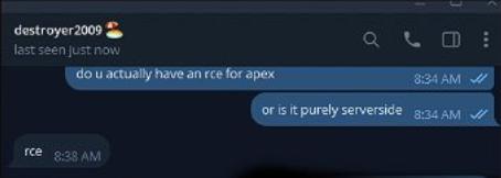 這些選手當然沒有主動使用外掛,全是入侵他們機器的黑客乾的。在入侵Genburten的機器時,黑客用他自己的帳戶,於聊天框留下了名字:“Apex外掛全球系列賽,由Destroyer2009和R4ndom獻上”。