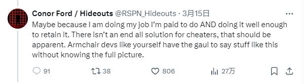 很快就有不少玩家在下方評論和Reddit等地方指出,反作弊團隊才應該首先被裁。面對玩家的質疑,福特在第二天發推表達異議,稱他們“對於那些受裁員影響的人,以及我們日復一日的工作,沒有表達出同情心。”