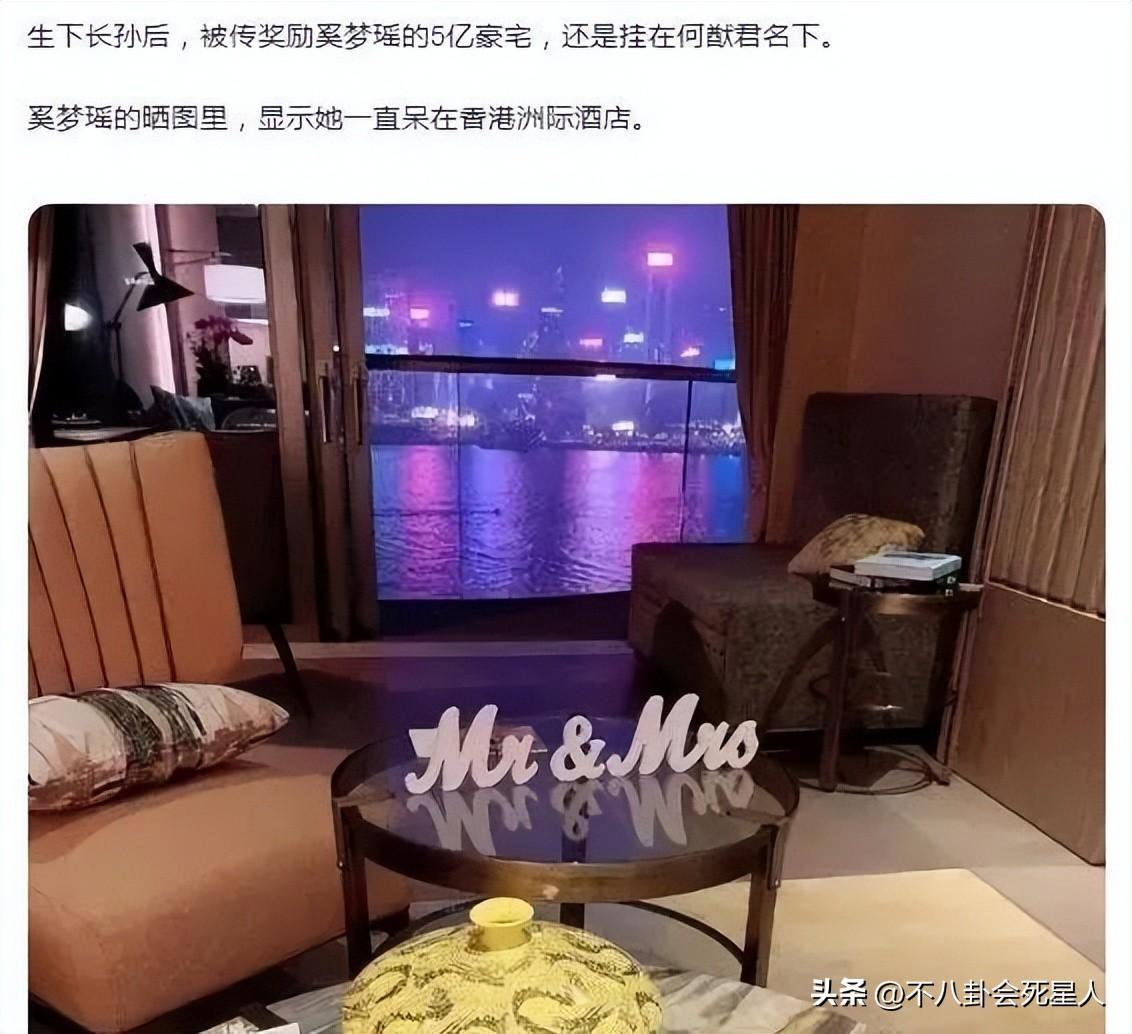 生下兒子後,何猷君和奚夢瑤一直定居上海,四太給他們買了一套價值5億的豪宅,但是隻寫了兒子何猷君的名字。要知道,這個時候奚夢瑤已經生了賭王長孫,很多豪門對兒媳婦生下孩子都會進行獎勵,但四太並沒有。