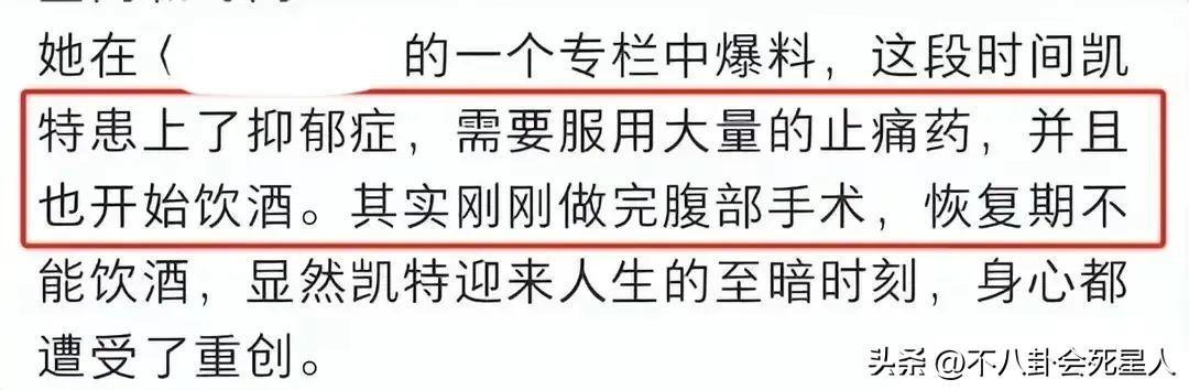 其實關於凱特暴瘦的消息之前就有主持人爆料過,凱特“消失”是因爲她的身體狀態不好,她患了抑鬱症,精神狀態很差,每天喫大量的止痛藥,而且還酗酒,但剛剛做了腹部手術的她不能喝酒,這些對她的身心都造成很大的傷害。