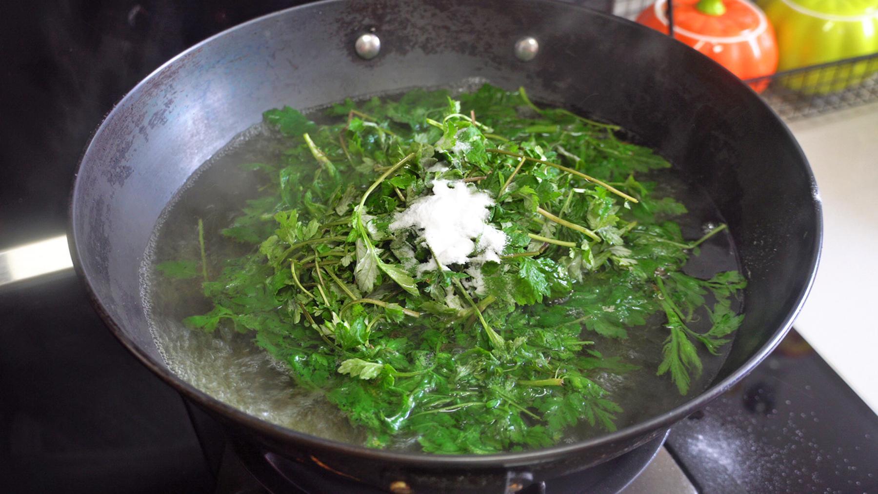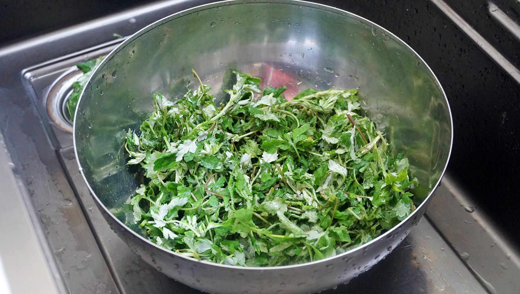 3、撈出來了再過一遍涼水,可以更好的去一下艾草的澀味,艾草這樣處理過後味道會很清香;