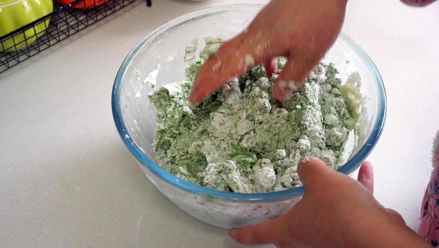 1、現在就可以開始和麪了,我這裏是加了600克的糯米粉、100克玉米澱粉、50克白糖 、500克艾草泥,攪拌一下,再加50克食用油,先簡單的揉一下,不用太費勁;